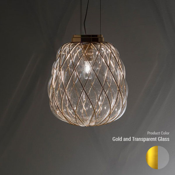 Pinecone is a pendant and table lamp mounting a blown glass diffuser, available in the glossy transparent or milky white acid-etched version. The diffuser is manufactured using the ancient caged blown glass technique: the glass maker blows the molten glass blob into a metal cage, which only partly contains the blob's natural expansion. In this way, the glass surface is partly trapped by and partly escapes the cage, generating an impression of tension as the object struggles to free itself from its harness; the cage is further enriched by the galvanic treatment that makes it look polished and brilliant. The transparent version, in particular, reveals a two-fold structure that multiplies the scenic effect, while the metal cage pattern projects kaleidoscopic shade effects on the surrounding surfaces. On the contrary, in the white version the glass delicately envelops the cage surface and enhances its geometric pattern, generating an elegant and visually pleasing diffuse light. Illuminated by a light source that can be chosen by the user, the lighting fixture makes a highly appealing and striking impact either switched on or off.