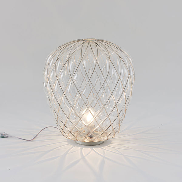 Pinecone is table lamp mounting a blown glass diffuser. The diffuser is manufactured using the ancient caged blown glass technique: the glass maker blows the molten glass blob into a metal cage, which only partly contains the blob's natural expansion. In this way, the glass surface is partly trapped by and partly escapes the cage, generating an impression of tension as the object struggles to free itself from its harness; the cage is further enriched by the galvanic treatment that makes it look polished and brillant.