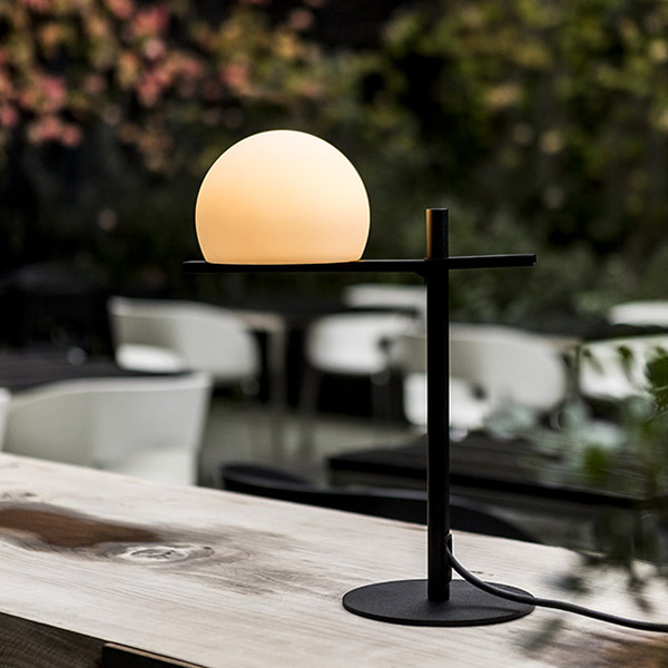 Metallic table lamp providing direct and indirect light. M-3728X: Outdoor locations, it is made of translucent beige polyethylene and metal body. Available in black and rust finish. Polyethylene shade. Ideal for the living room, garden, terrace, bedroom, restaurant and bar.