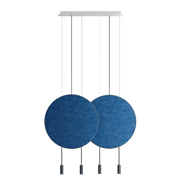 Suspension lamp with a circular body and two different diameters. Cylindrical aluminium heads and acrylic (PMMA) lens diffusers. Adjustable height. Optional 50º angle acrylic optic lens conversion kit and decorative sound absorbing panel.