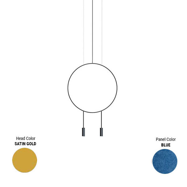Suspension lamp with a circular body and two different diameters. Cylindrical aluminium heads and acrylic (PMMA) lens diffusers. Adjustable height. Optional 50º angle acrylic optic lens conversion kit and decorative sound absorbing panel.