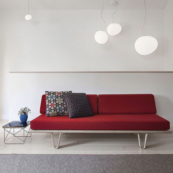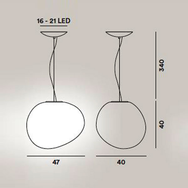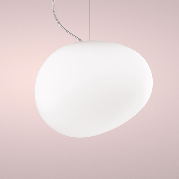 A product of natural inspiration and extensive research, Gregg’s shape is reminiscent of a large pebble, its surface polished by the water. It could even be seen as the egg of some mythological beast, a symbol of creation and re-birth. Pure volume with a familiar ease of interpretation, yet one that is surprising, because Gregg’s asymmetric shape changes depending on the point of view of the person observing it. This is a new solution where a traditional material like glass becomes a tool in the designer’s hands to give an original character to an environment. There are three different sizes in the hanging, table, ceiling and wall versions and four di)erent solutions for the floor lamp: the Gregg collection is one of the most versatile and transversal and can be easily placed in any type of setting. In the home environment the warm, uniform light produced by the white satined diffuser and its essential style have a strong functional and decorative value. Thanks to the closed shape of the diffuser, the bulb is screened in all directions, which protects from dazzle and makes it easy to place even at different heights. When part of a composition, Gregg is suitable for some of the most surprising uses. A ‘raindrop’ structure highlights the vertical extension of a window or stairway, producing an extremely striking e)ect. Vertical arrangement of a multitude of suspensions at various heights generates spectacular luminous false ceilings. The repetition of the volume along a line produces new perspectives to create trompe l’oeil e)ect. pag.