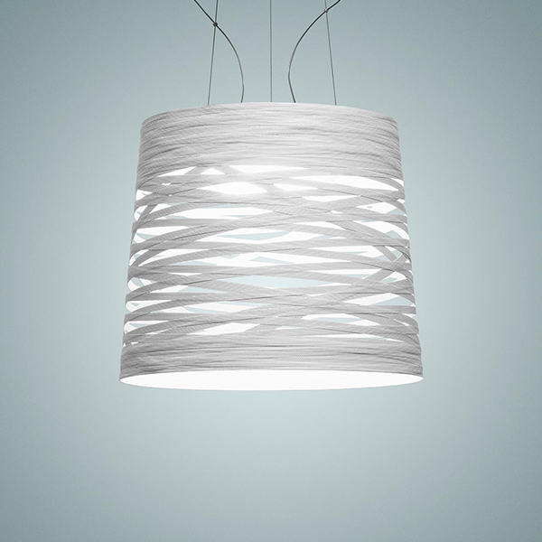 Suspension lamp with diffused and direct light. The fibreglass-based composite material diffuser is produced by modelling tape along a mould with an automatic control of the pitch/pattern, which is then liquid coated. In the large version, blown glass internal diffuser with acid etched finish, satin finish opaline glass upper screen and chromed metal frame, in the other versions chromed metal mount. Fitted with three stainless steel suspension cables for the large version, one for the other versions, and transparent electrical cable. Ceiling canopy with galvanised metal bracket and glossy chromed batch-dyed ABS cover. Canopy decentralisation kit – multiple canopy available (up to 6 or 9 suspension lamps).