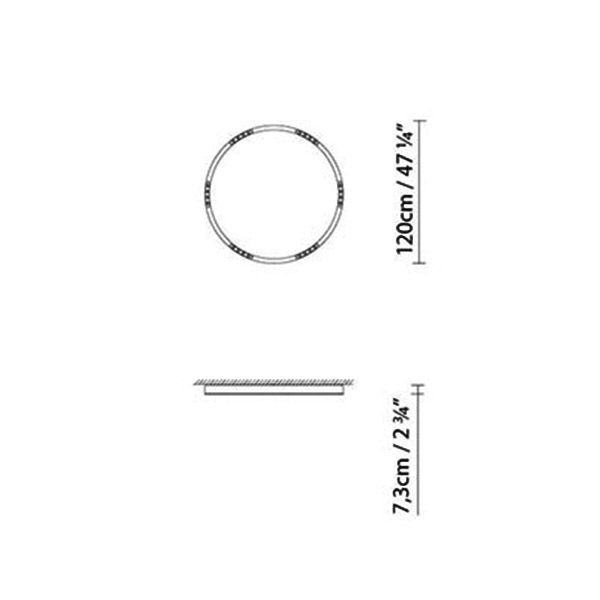Aluminium ceiling lamp shaped like a circular ring. For its light source, it uses LED floodlight modules that provide uniform lighting. Finishes: matte white, matte bronze, matte black, natural oak wood or walnut. Available in three sizes. Dimmer.