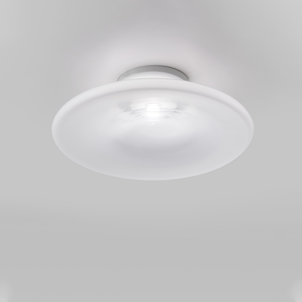 White crystal corollas. The stem develops thinly and then opens up in a mouth with crystal profiles. The LED source lights up the white shaded glass of the suspension and ceiling lamp versions. Neutral tones and simple, elegant lines make it possible to contextualise it in environments with the most diverse styles.