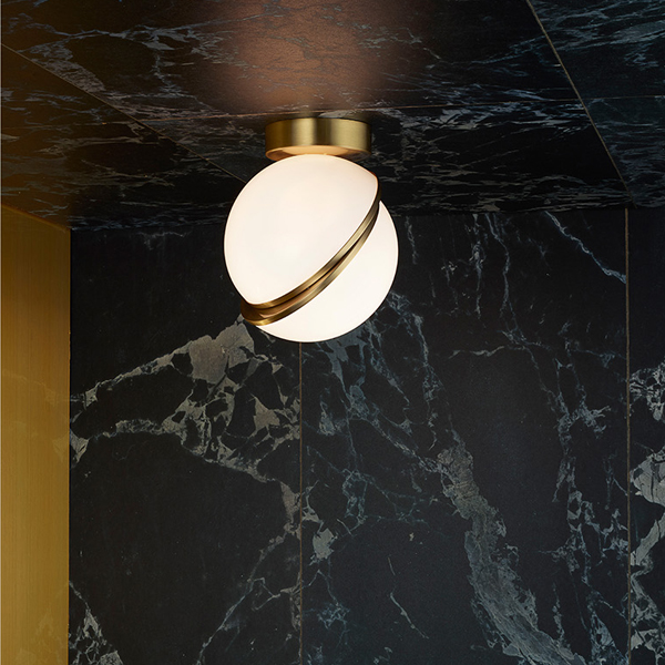 An illuminated sphere sliced in half to reveal a crescent-shaped brushed brass fascia, Crescent Light seamlessly combines the solid and the opaque.