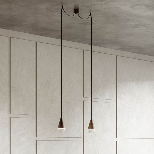 The clear-cut lines of the Dew collection of Italian indoor lamps highlight the pure nature of iron. The pendant lamp can be used on its own or combined with others to create linear compositions or groups with a spectacular effect. Dew is also available in a modern wall/ceiling lamp version.