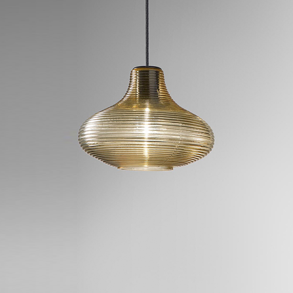 | Technical Details | Suspension lighting fixture for interiors, with direct and indirect light emission. Rough aluminium structure. Diffuser in blown glass with white, crystal, steel, amber, bronze, tobacco or green ribbing finish. Turned pickled sheet metal closing disk in black or mat brass polyacrylic paint. 2,2m (86,6") long suspension and power cable in PVC with black fabric covering. Power canopy with galvanized sheet metal ceiling bracket and pickled sheet metal covering in black or mat brass polyacrylic paint. |