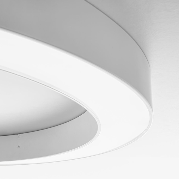Aluminium ring with bottom high-transmittance screen in opal polycarbonate. Available in wall/ceiling and suspension versions. Emission of direct light provided by LED module with technology DALI/Push DIM on all versions. Ring eventually finished in polyacrilic paint white, black, bronze or hand-decorated in golden leaf. Custom colors are available on request. Suspended version supplied with 3 steel cable adjustable in lenght (6 cables for ø 180cm). The wall/ceiling version is supplied with a simplified mounting kit. Ideal for residential use, compositions for offices, hospitality facilities and public spaces. Delivery of the product in a single piece already assembled.