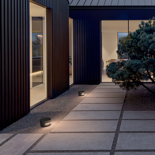 Diminutive, compact and easily integrated into any garden, Dots Outdoor is the perfect solution for a range of exterior low lighting needs. Each luminaire is carved with a rounded opening that reflects light from an internal source, creating a halo of ambient light like a radiant crown. The second version’s other side is closed, allowing the designer to play with the direction of light and ease any intensity.