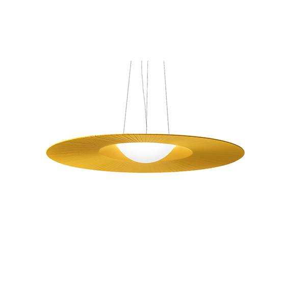 A futuristic design with a harmonious sense of proportion, the large central diffuser irradiates light that seems to acquire substance in the disc surrounding it. A veritable ray of colour that spreads throughout the environment. Pendant, wall/ ceiling lamp with lampshade in hand-finished pleated or pleated ribbon fabric. Bottom cap in thermoformed opal PMMA with soft touch finishing.
