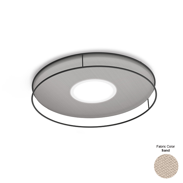 Lightweight metal structures frame fabric discs, at the centre of which is the light source itself. Idea creates a unique and original decor in any space. Available as a hanging lamp, ceiling or wall lamp, it is designed to work alone or as a composition. Single or in composition pendant, wall/ ceiling lamp. Embossed white or graphite painted metal structure. Inner disc upholstered with lycra fabric. Lamp with acoustic comfort features.