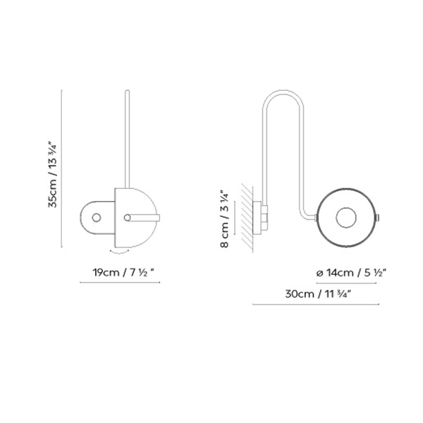 LED wall lamp made with half-sphere shades. Available with either one shade (W1 left and W1 right), both with a switch, or two shades (W2). On all these lamps, the light source can be adjusted on its horizontal axis and gives direct and diffused light. Available in metallic English bronze, black, matte turquoise and matte beige.