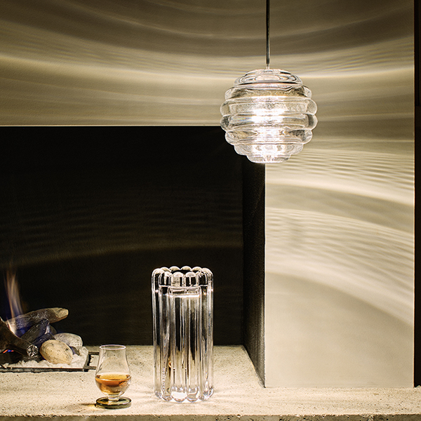 A stunning contemporary mini pendant light made of the thickest industrially pressed glass. Designed and engineered to catch and refract light, and to last for ever. The ribbed glass creates diffusion of the light source and projects linear and stripy patterns. Press Sphere Mini is a new pendant which is more compact in size, lighter in weight and designed to be clustered and hung in multiples. This product is IP45 rated. It can be used indoors and outdoors. Press pendants have a unique pressed glass ceiling rose, which is a beautiful decorative detail often overlooked. The tiny bubbles in the glass are a celebration of how the products are made and naturally appear when the glass is hand-pressed. Press is available with a warmer 2700K LED as standard.