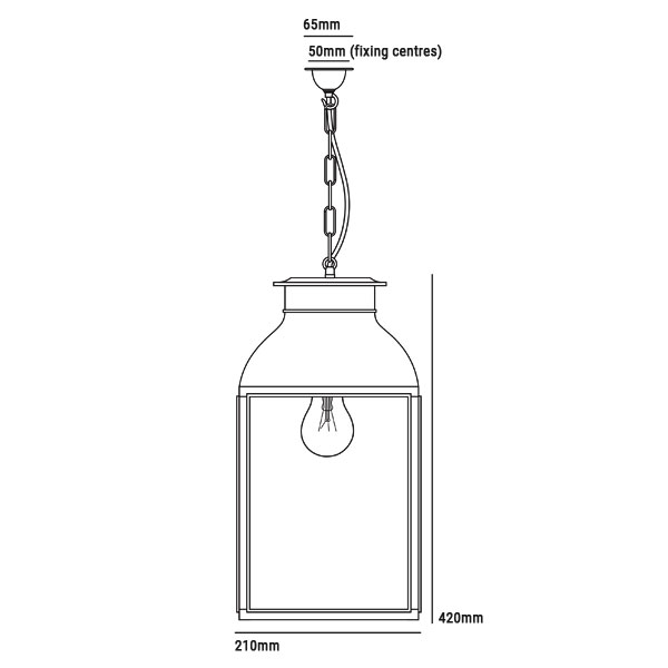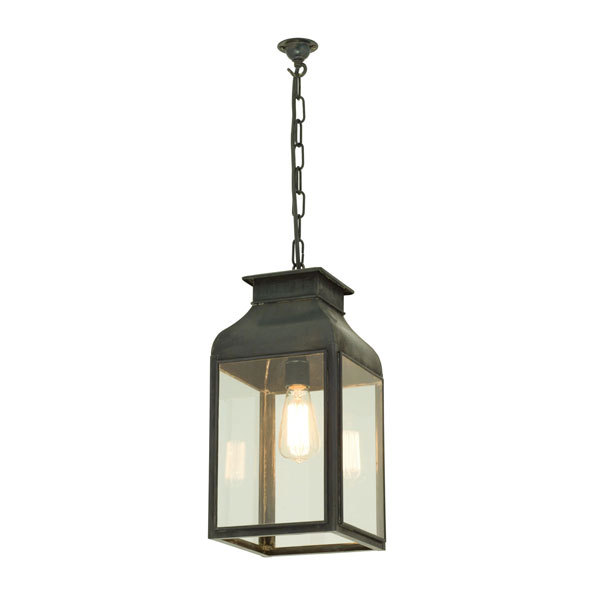 Davey Lighting: Square box pendant in weathered brass, for interior use. Suspended on weathered brass hook with 1.5 meters of chain. Glass on four sides, with open top and base.