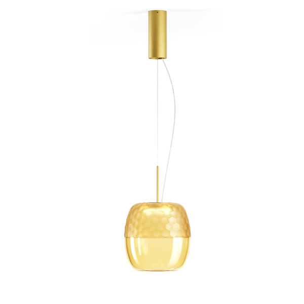 Technical Details | Suspension lighting fixture for interiors, with direct light emission. Aluminium frame with polyacrylic paint finish in mat black or mat brass. Diffuser screen in acrylic material with satin finish. Handmade and hand-ground blown glass in bronze colour. Steel closing plate with polyacrylic paint. Transparent PVC coaxial suspension and power cable 3m (118. 1") long. Feeding canopy with ceiling mounting bracket in pickled sheet metal and extruded aluminium housing with polyacrylic paint in mat black or mat brass finish. DALI / Push Dim driver integrated in the canopy. |