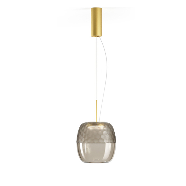 Technical Details | Suspension lighting fixture for interiors, with direct light emission. Aluminium frame with polyacrylic paint finish in mat black or mat brass. Diffuser screen in acrylic material with satin finish. Handmade and hand-ground blown glass in bronze colour. Steel closing plate with polyacrylic paint. Transparent PVC coaxial suspension and power cable 3m (118. 1") long. Feeding canopy with ceiling mounting bracket in pickled sheet metal and extruded aluminium housing with polyacrylic paint in mat black or mat brass finish. DALI / Push Dim driver integrated in the canopy. |