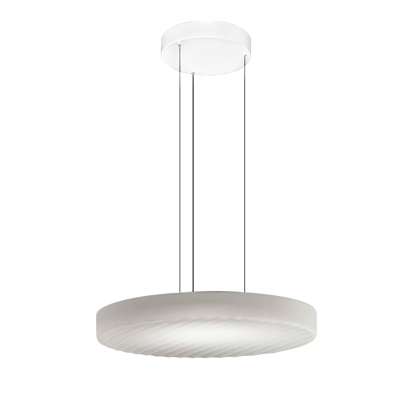 Technical Details | Suspension lighting fixture for interiors, with direct light emission. Die-cast aluminium structure in black or white polyacrylic paint. Diffuser screen made of frosted blown glass with matt white or smoke grey finish. 2m (78,7") long steel suspension cables. 2,2m (86,6") long power cable in transparent PVC. Power canopy with metal ceiling bracket and pickled sheet metal covering in white or black polyacrylic paint. |