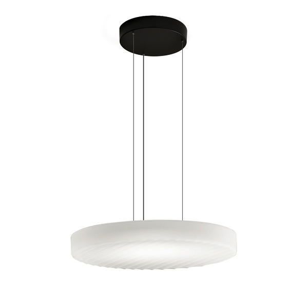 Technical Details | Suspension lighting fixture for interiors, with direct light emission. Die-cast aluminium structure in black or white polyacrylic paint. Diffuser screen made of frosted blown glass with matt white or smoke grey finish. 2m (78,7") long steel suspension cables. 2,2m (86,6") long power cable in transparent PVC. Power canopy with metal ceiling bracket and pickled sheet metal covering in white or black polyacrylic paint. |