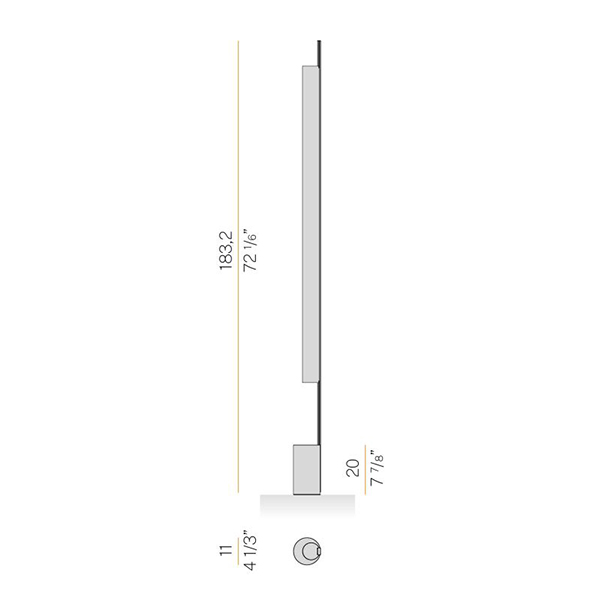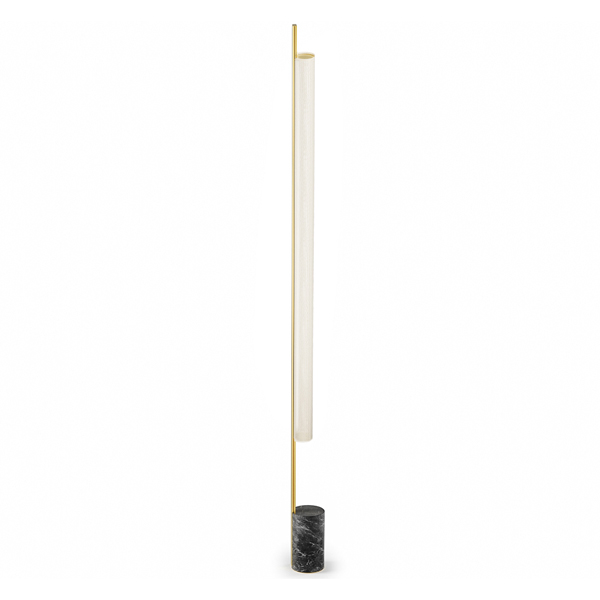 Technical Details | Floor lighting fixture for interiors, with direct light emission. Bearing base in white marquina black marble. Extruded aluminium frame with polyacrylic paint finish in mat black or mat brass. White PVC-coated woven fabric shade. Polycarbonate inner diffuser screen. Supplied with 3m (118,1") long black fabric power cord complete with box with push-button for adjusting light intensity and plug adapter. |