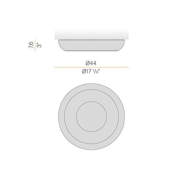 Technical Details | Ceiling or wall lighting fixture for interiors, with direct light emission. Turned steel structure in textured soft white, mat black, champagne, bronze, textured myrtle blue and textured natural terracotta polyacrylic paint. Aluminium wiring support plate with polyacrylate paint finish. Curved diffuser screen made of matt PMMA technopolymer. DALI/Push DIM driver available on request. |