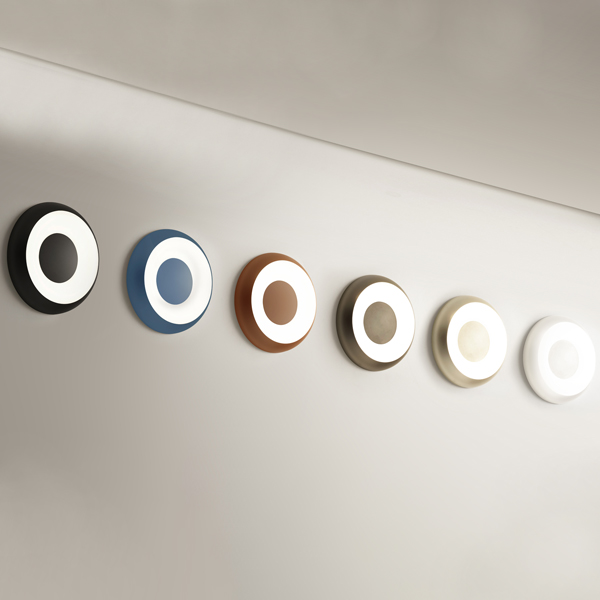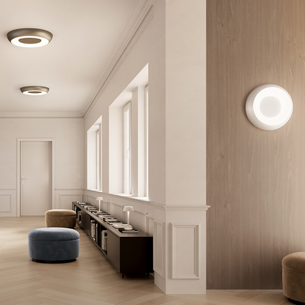The Superbold collection is inspired by the simplicity of the circle, a precise sign that with its soft and timeless shapes dialogues with space in a discreet manner. The small footprint and the diffused light filtering through the opaque technopolymer ring allow it to furnish and illuminate different types of domestic and public environments from walls and ceilings. Superbold is available in two sizes in textured soft white, satin black, bronze, satin brass, textured myrtle blue, and textured natural terracotta finishes, which provide different visual and tactile effects, characterising the space in which they are inserted. DALI/Push DIM available on request.