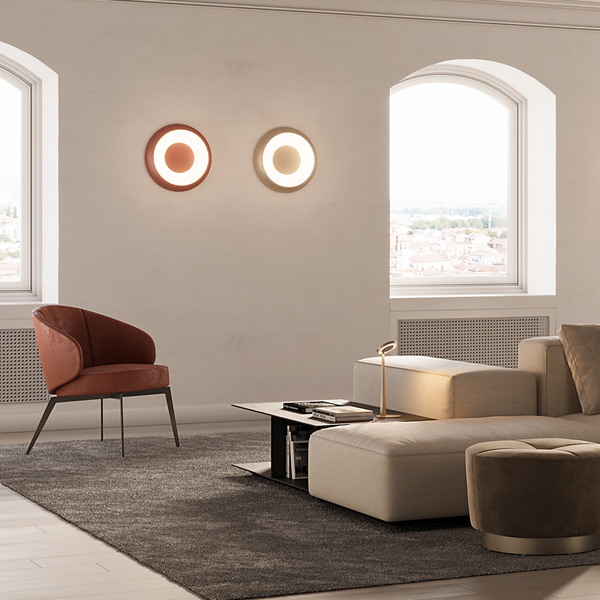 The Superbold collection is inspired by the simplicity of the circle, a precise sign that with its soft and timeless shapes dialogues with space in a discreet manner. The small footprint and the diffused light filtering through the opaque technopolymer ring allow it to furnish and illuminate different types of domestic and public environments from walls and ceilings. Superbold is available in two sizes in textured soft white, satin black, bronze, satin brass, textured myrtle blue, and textured natural terracotta finishes, which provide different visual and tactile effects, characterising the space in which they are inserted. DALI/Push DIM available on request.