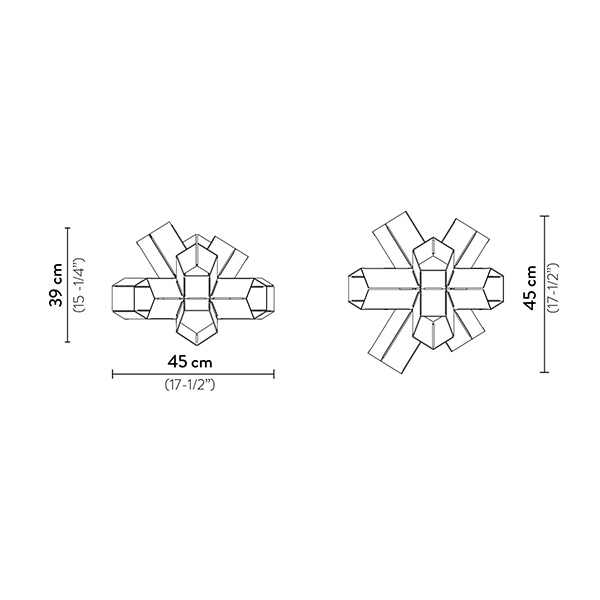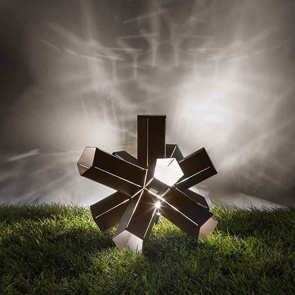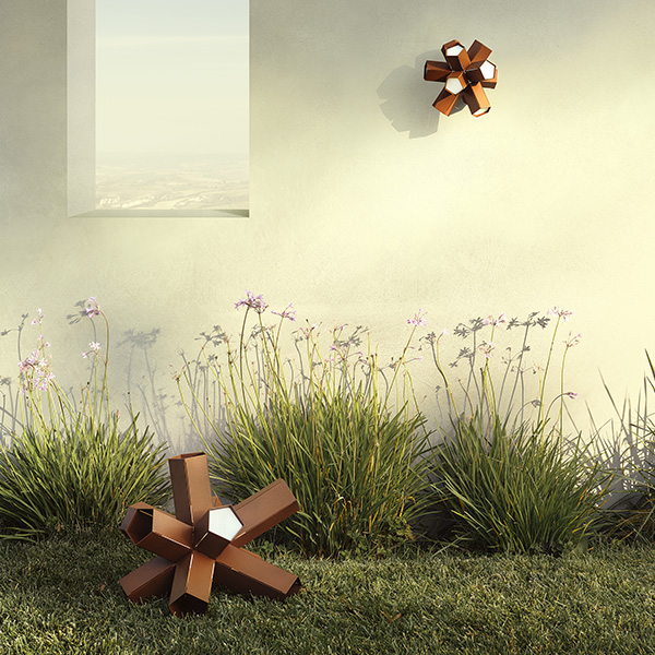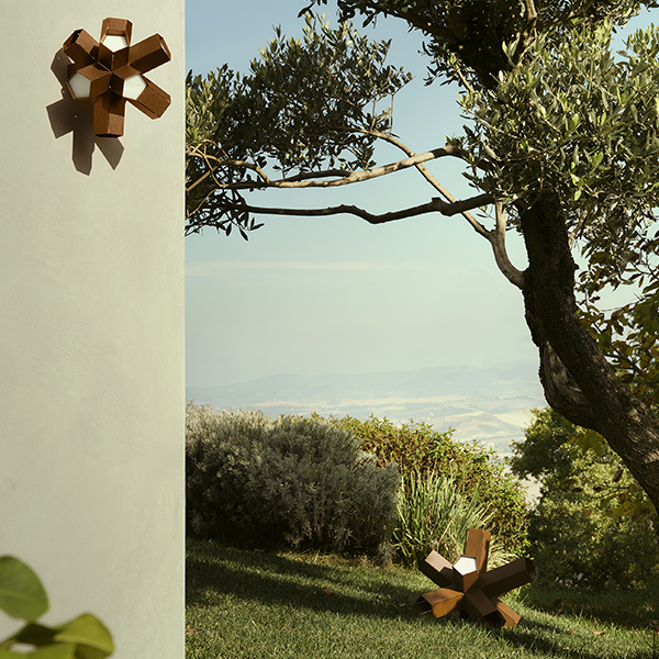 Bang is a celebration of the power of light: an explosion of creativity. Like a supernova, from whose core an unpredictable geometry unfolds, Bang reveals itself as ever-changing, depending on the perspective from which it is observed. 10 pentagonal arms of varying lengths radiating outward from the lamp’s center, emitting light through the light cuts and diffusers. Available in 2 dimension and 3 finishing. The step light/applique (22 x h 20 cm) can be wall-mounted or installed as steplight thanks to the pentagonal support easily fixed with screws.