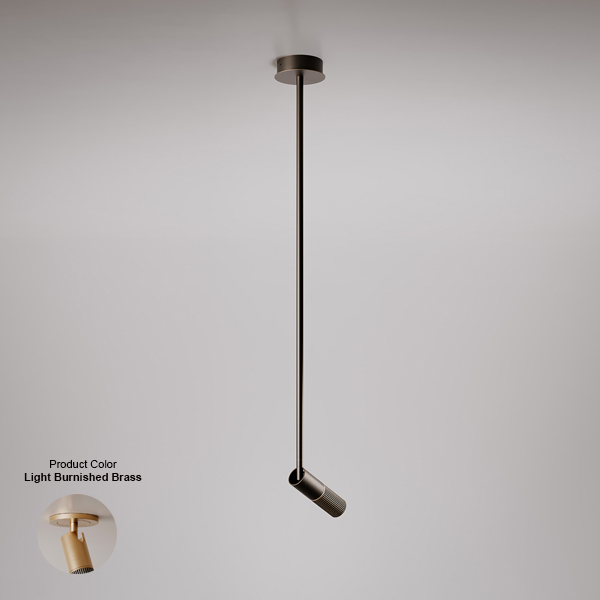 The Beak Suspension’s adjustable cylinder directs and projects a beam of direct light. Its smooth, burnished brass finish is accented by knurling on the head, adding visual rhythm to the structure. Supported by a central rod that lends verticality to the composition, Beak Suspension is available in both a standard and Flat version with a reduced-thickness canopy. The Beak collection also includes Ceiling/Wall, Floor, and Table models.