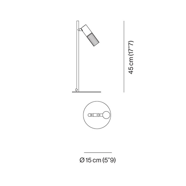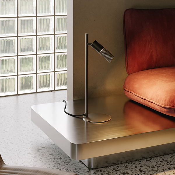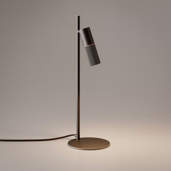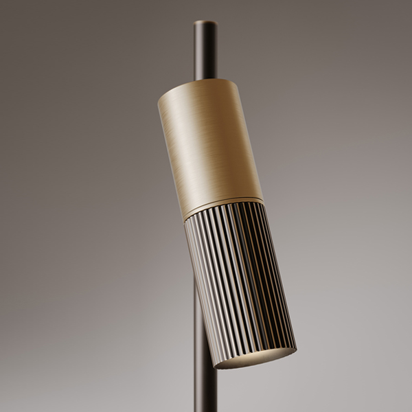 The Beak Table’s adjustable cylinder directs and projects a beam of direct light. Its smooth, burnished brass finish is accented by knurling on the head, adding visual rhythm to the structure. A metal rod extends from the base, supporting the light source at the head. The metal structure is available in both light and dark burnished brass finishes. Beak is also available in Ceiling/Wall, Floor, and Suspension versions.