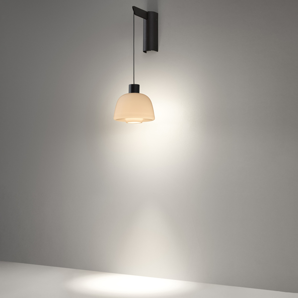 Drep is a natural evolution of Drip & Drop: a blown glass shade that softens the light and envelops the space. Its carefully designed shape and bottom opening combine diffuse and direct light, without altering the matrix system shared by the three pieces.