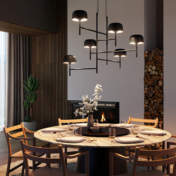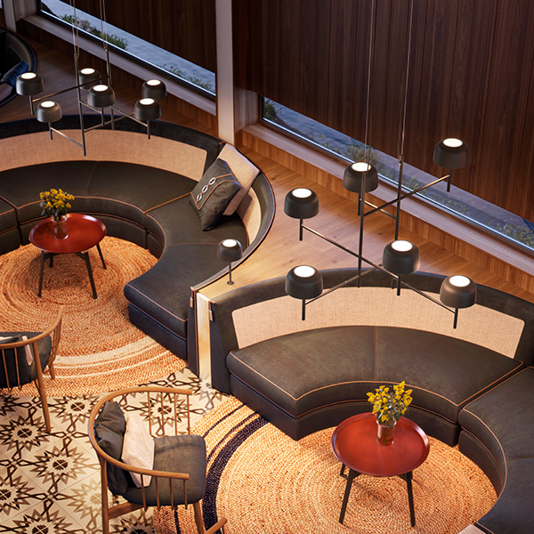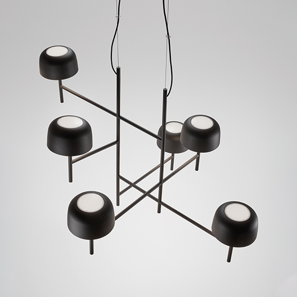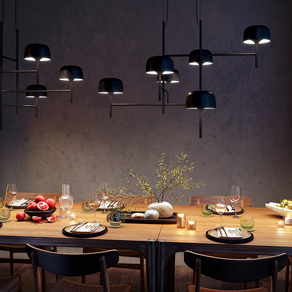 Inspired by classic Maria Theresa chandeliers, the Bol light emerged as a large, contemporary chandelier whose charm resides in its opaque body and the upper and lower light path emitted by its shades. In addition, there are other applications available, such as floor, wall or table lamp. Lightweight, floating structures with an understated, stylish lighting effect in the dark. The central structure of Bol lights comprises different stems and shade bodies that can be connected to one another via a central pole. This allows different figures to be devised, both horizontally and vertically, even continuous sequences.