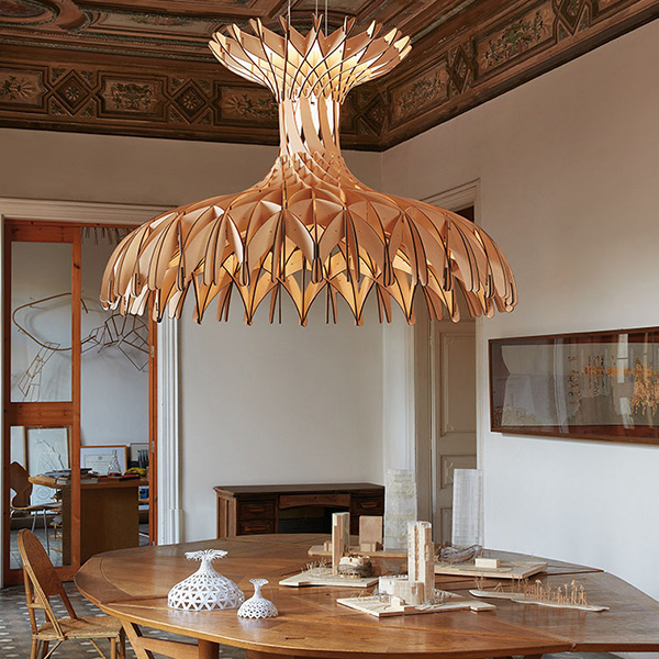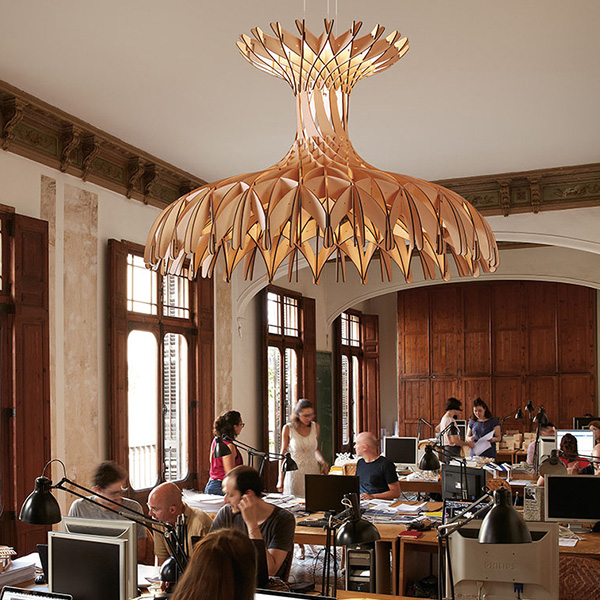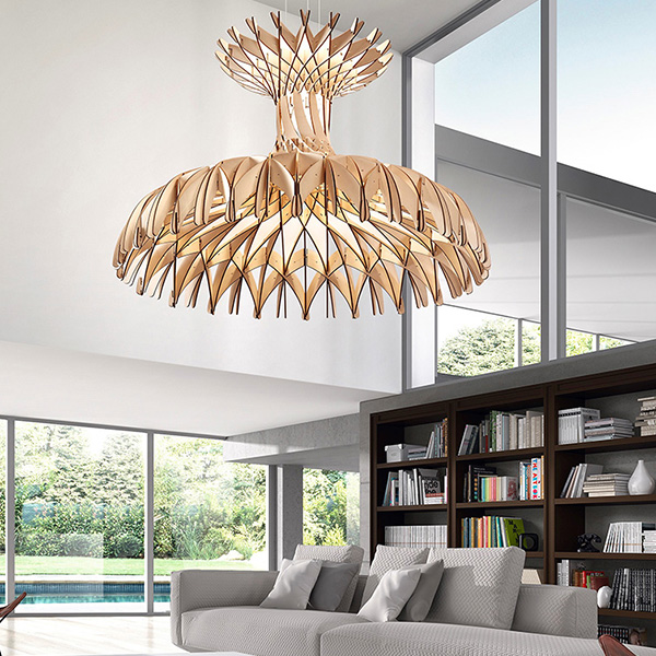 The integration of design, art and light in architecture dates back to a long time ago, and maybe this is the reason why lamps have gradually stopped being just an item emitting light to become a light sculpture which confers a special personality to the product and its environment. More than 170 big and small wood fragments are wisely intertwined and sewed one by one to end up in such a jigsaw puzzle.