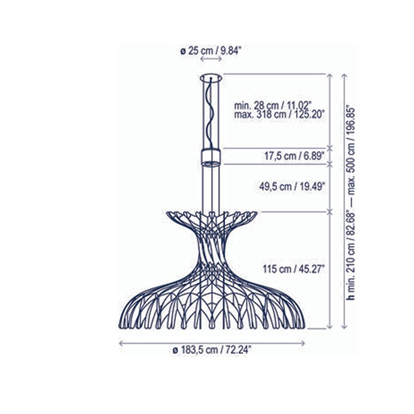 | Dimensions | Suspension Diameter: 72.24 inch, Suspension Height: 45.27 inch, Canopy Diameter: 9.84 inch, Suspension Max Height From Ceiling To Shade: 196.85 inch |