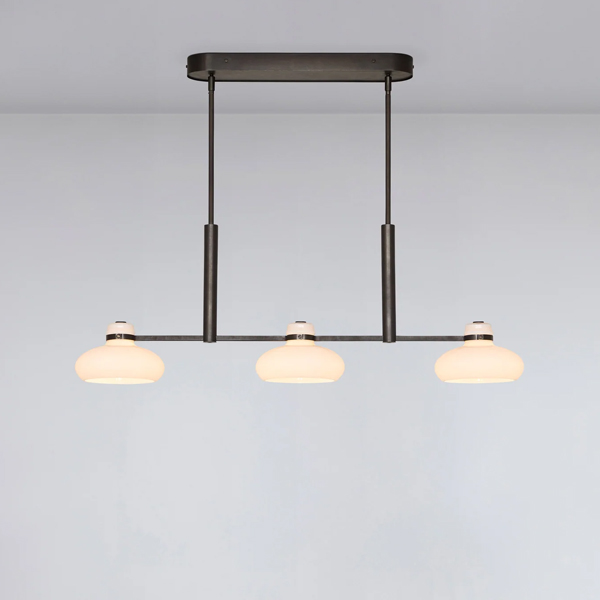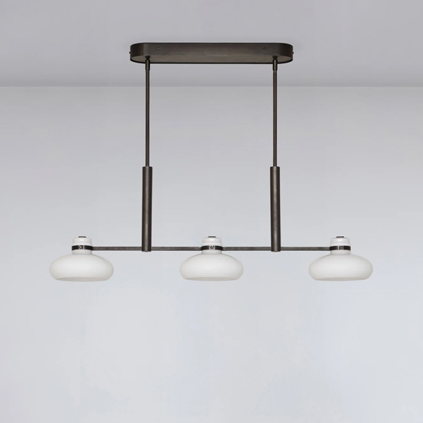 The Magnus pendant captures the fluidity and natural movement of molten glass. Sculptural shades in soft opal white are held in a sleek metal frame in rich blackened bronze. The fixture provides plenty of direct lighting to surfaces below, while the shades emit a warm glow, enriching the atmosphere of any room. Every angle has been considered, ensuring the pendant appears clean and refined even when viewed from above, and maintains its integrity across a wide range of interiors. The Magnus S3 offers three evenly spaced shades, creating a balanced, linear design perfect for medium-sized dining tables or kitchen islands. The Magnus series includes two and four shade pendants in a linear arrangement, and four and six shade options in a multi-arm configuration.