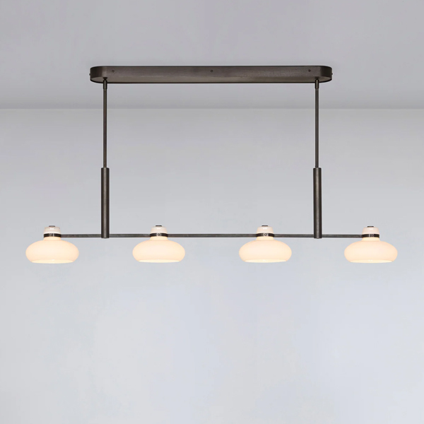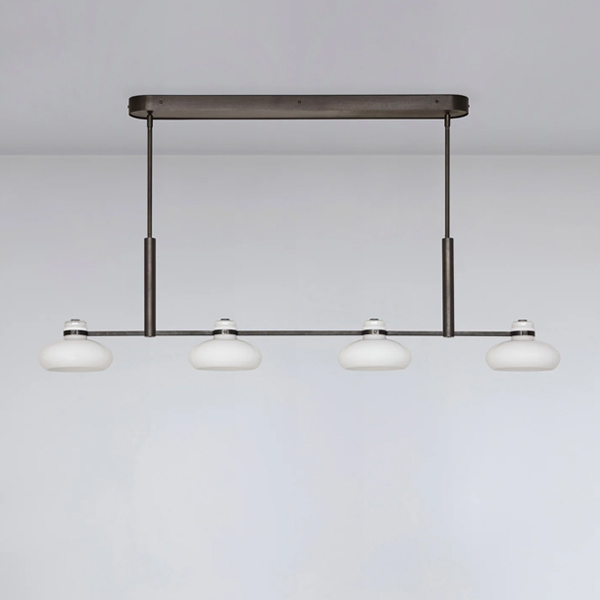The Magnus pendant captures the fluidity and natural movement of molten glass. Sculptural shades in soft opal white are held in a sleek metal frame in rich blackened bronze. The fixture provides plenty of direct lighting to surfaces below, while the shades emit a warm glow, enriching the atmosphere of any room. Every angle has been considered, ensuring the pendant appears clean and refined even when viewed from above, and maintains its integrity across a wide range of interiors. The Magnus S4 pendant features four sculptural shades arranged in a streamlined composition, ideal for longer tables or kitchen islands. The Magnus series includes two and three shade pendants in a linear arrangement, and four and six shade options in a multi-arm configuration.