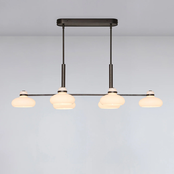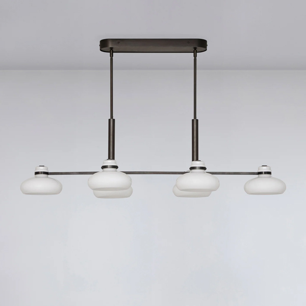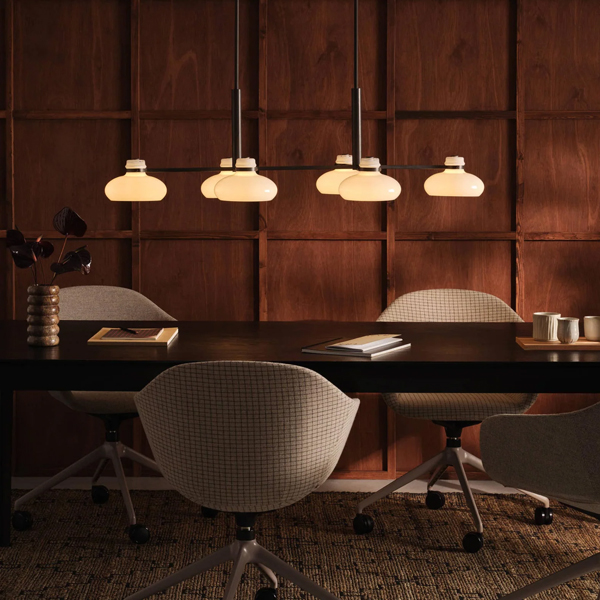 The Magnus pendant captures the fluidity and natural movement of molten glass. Sculptural shades in soft opal white are held in a sleek metal frame in rich blackened bronze. The fixture provides plenty of direct lighting to surfaces below, while the shades emit a warm glow, enriching the atmosphere of any room. Every angle has been considered, ensuring the pendant appears clean and refined even when viewed from above, and maintains its integrity across a wide range of interiors. The Magnus pendant with six shades makes a bold statement in larger living rooms, dining rooms, or entryways. For more compact spaces, the series also include a version with four shades and three models with shades arranged in a linear formation.