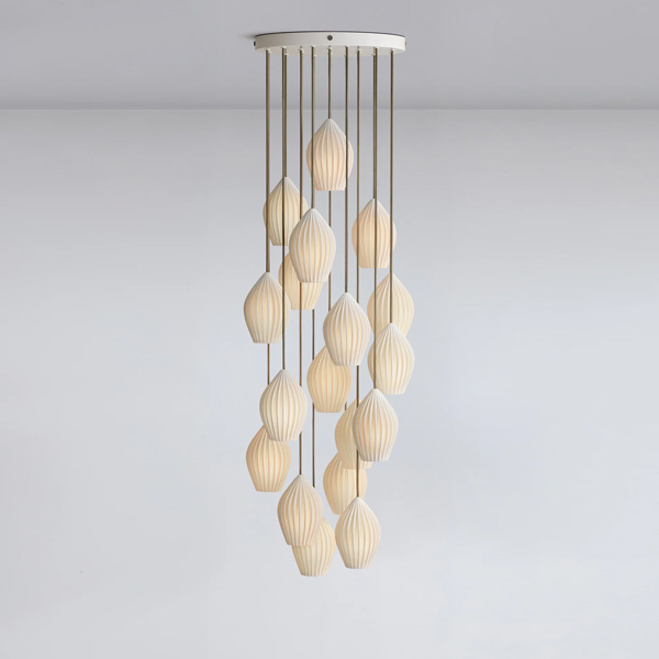 The Fin Grouping brings spectacular impact to one of our most beloved designs. Featuring 12 or 18 individual pendants, this dramatic composition transforms stairways, hallways, receptions and larger living areas. The intricate handmade bone china shades emit a generous downward light while glowing beautifully themselves to enrich the atmosphere of the room. Turned off, the glazed ceramic appears architectural and refined. Perfect for creating a stunning focal point, each grouping is supplied with grey cotton braided cables, and every pendant’s height can be individually adjusted during installation, allowing for a tight cluster or a space-filling cascade of light.