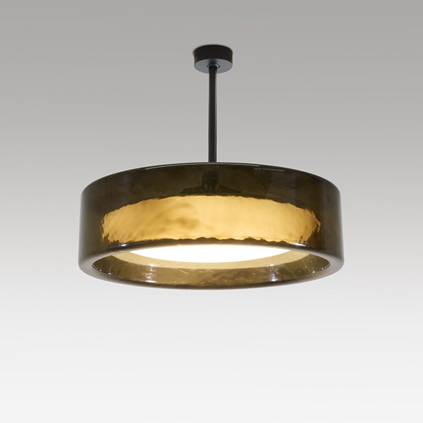 Above all, the Ringo collection is a brave design: a large pendant or ceiling lamp that accentuates material rather than form. Essentially, it’s a basic geometric shape in volume but its material is astonishing, resembling a block of ice, at the same time both solid and weightless. Its designer, Joan Gaspar, has used transparent polycarbonate to create optical reflections, giving the impression of an organic design made out of glass. Its large size is in keeping with its function, since it’s been designed to illuminate large and considerably high spaces, contemporary architectural projects ranging from hotels to contract, in which a lot of light is required. Its transparency means that it blends in readily and harmonises with the space, also when repeated. A design with an innovative proposal: its shade distributes and regulates the direct light homogeneously whilst also revealing what’s happening inside. Ringo sets ups a dialogue between light and matter. Switched off it’s a forceful object with a strong presence; switched on its transparency defines its volume and filters the light. An interplay of opposites in which the light manages to make the material less dense and its design weightless. Available in a ceiling version (with a fixed pole or built-in) and a pendant version, in two sizes, 70 and 90 cm, and in four finishes: green, rosé, smoke, and dark smoke. Height extension poles of 40 and 60 cm allow you to increase the drop length from the ceiling while retaining the rigid stem. It also has three colour temperatures: 27K, 30K and 40K.