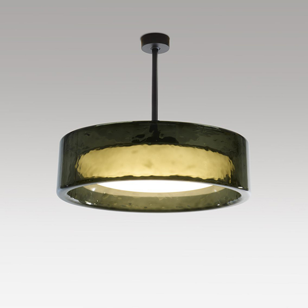 Above all, the Ringo collection is a brave design: a large pendant or ceiling lamp that accentuates material rather than form. Essentially, it’s a basic geometric shape in volume but its material is astonishing, resembling a block of ice, at the same time both solid and weightless. Its designer, Joan Gaspar, has used transparent polycarbonate to create optical reflections, giving the impression of an organic design made out of glass. Its large size is in keeping with its function, since it’s been designed to illuminate large and considerably high spaces, contemporary architectural projects ranging from hotels to contract, in which a lot of light is required. Its transparency means that it blends in readily and harmonises with the space, also when repeated. A design with an innovative proposal: its shade distributes and regulates the direct light homogeneously whilst also revealing what’s happening inside. Ringo sets ups a dialogue between light and matter. Switched off it’s a forceful object with a strong presence; switched on its transparency defines its volume and filters the light. An interplay of opposites in which the light manages to make the material less dense and its design weightless. Available in a ceiling version (with a fixed pole or built-in) and a pendant version, in two sizes, 70 and 90 cm, and in four finishes: green, rosé, smoke, and dark smoke. Height extension poles of 40 and 60 cm allow you to increase the drop length from the ceiling while retaining the rigid stem. It also has three colour temperatures: 27K, 30K and 40K.