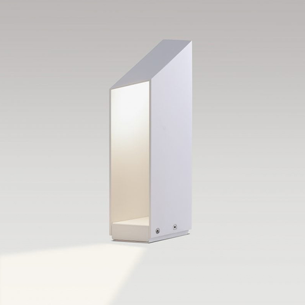 An illustration full of illuminated houses was what inspired Joan Gaspar to present Domus, the new collection of bollard lights for outdoor use. It’s essentially an architectural design with linear forms, the upper part creating a unique asymmetrical shape. This bollard reveals its empty interior which, when switched off, communes with the natural light and is replete with nuances. When switched on, its own light enriches the space, resembling a cubicle and reminiscent of the house with its lights on inside that originally inspired the design. Domus hides its light, refusing to reveal where it comes from, and projects a subtle angle of illumination. The beauty of this new bollard lies in how its form plays with and defines its light. It can be installed individually but takes on a sculptural feel in combinations of two or three units, the beam of light spreading in different directions and achieving greater breadth. This is when, on seeing the bollards, their compositional appearance can truly surprise. This aluminium design is available in 26, 36, and 55 cm heights, in white, black, and rust brown finishes, and has accessories that enable two or three bollards to be joined together.