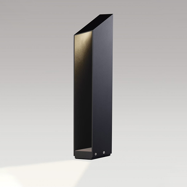 An illustration full of illuminated houses was what inspired Joan Gaspar to present Domus, the new collection of bollard lights for outdoor use. It’s essentially an architectural design with linear forms, the upper part creating a unique asymmetrical shape. This bollard reveals its empty interior which, when switched off, communes with the natural light and is replete with nuances. When switched on, its own light enriches the space, resembling a cubicle and reminiscent of the house with its lights on inside that originally inspired the design. Domus hides its light, refusing to reveal where it comes from, and projects a subtle angle of illumination. The beauty of this new bollard lies in how its form plays with and defines its light. It can be installed individually but takes on a sculptural feel in combinations of two or three units, the beam of light spreading in different directions and achieving greater breadth. This is when, on seeing the bollards, their compositional appearance can truly surprise. This aluminium design is available in 26, 36, and 55 cm heights, in white, black, and rust brown finishes, and has accessories that enable two or three bollards to be joined together.
