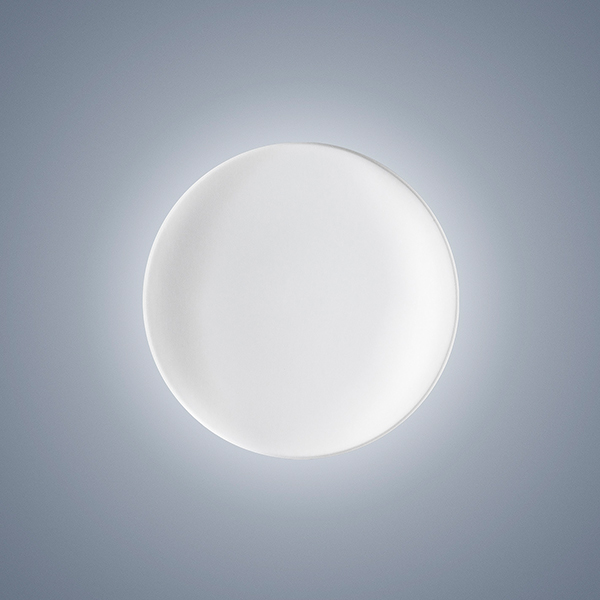 Wall or ceiling lamp for indirect and reflected lighting that combines functionality with aesthetics. The slightly concave disc in brushed aluminum,has a pigmented transparent coating to add depth and substance to the color, creating a mirror effect. The technical lighting fixture, placed on the back of the lenticular disc and wall-mounted, is formed by an aluminum cylinder that supports the LED circuit, screened by a cylinder in opaline satin-finish glare-proof PMMA. When on, it emits a powerful light that illuminates large surfaces without causing glare; when off, it reflects its surroundings and captivates with anamorphic distortions. Also available in a white powder-coated version that can be painted as desired based on the décor.