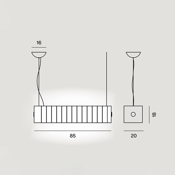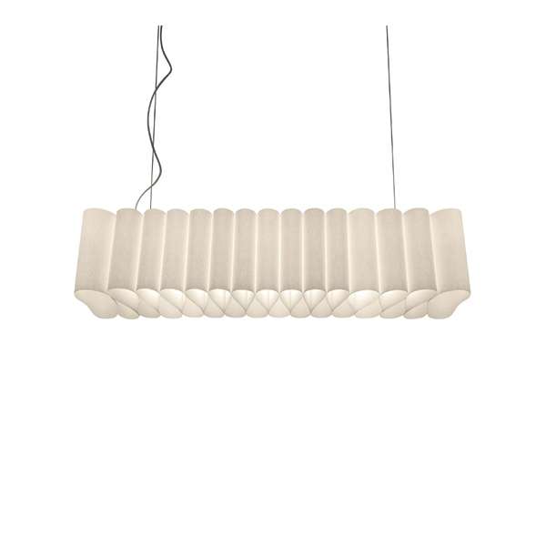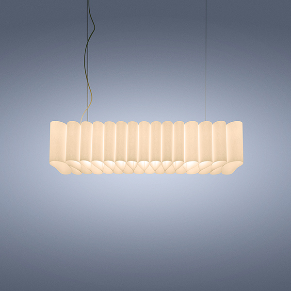Suspension lamp with direct, indirect, and semi-diffused light that brings a warm and enveloping atmosphere to interiors. The PMMA body houses an aluminum tubular structure with LED strips. The diffuser is a long ribbon of fine Italian art paper, made with 100% cotton fibers, folded into soft draping, and held in place at the ends with two round caps in natural , satin-finished aluminum with a transparent coating. Steel suspension cables, transparent electrical cord, matte white ceiling plate in ABS to contain the transformer.