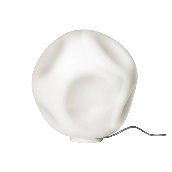 A table lamp with an anti-geometric shape and diffused light, crafted from mouth-blown, acid-etched opal glass. A special process of blowing the glass, unrotated in an open mold, allows for slightly different shapes, resulting in a collection of ever-changing pieces, mass-produced yet with the unique qualities of handmade. From all sides, Hoba appears to continually change, thanks to its glassy surface characterized by soft depressions. The base is made of painted metal.