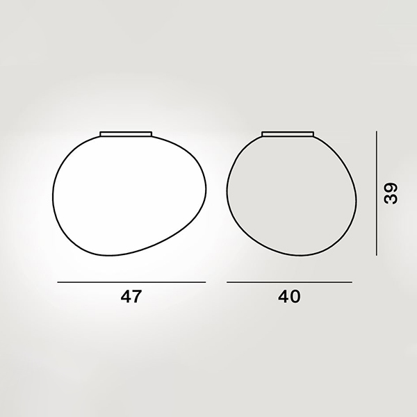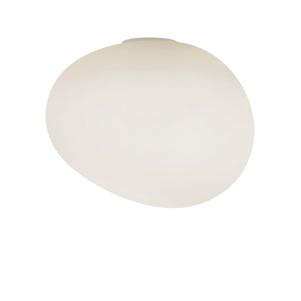 Ceiling lamp with diffused light. White satin finish hand-blown diffuser achieved using a glass blowing procedure without turning the glass in the mould (referred to as “stationary”), which then undergoes immersion in acid. The glass in the medium version is incorporated with a matt transparent injection moulded polycarbonate ring nut, which is in white polycarbonate in the small version. Mount and ceiling mount in epoxy powder coated metal and matt injection moulded transparent polycarbonate lamp holder support.