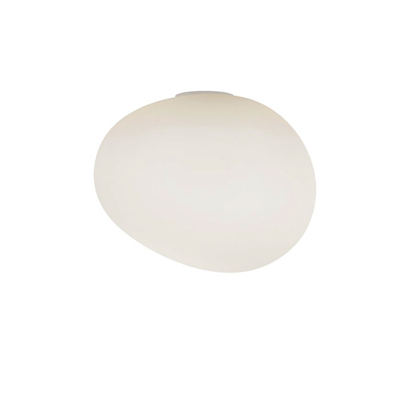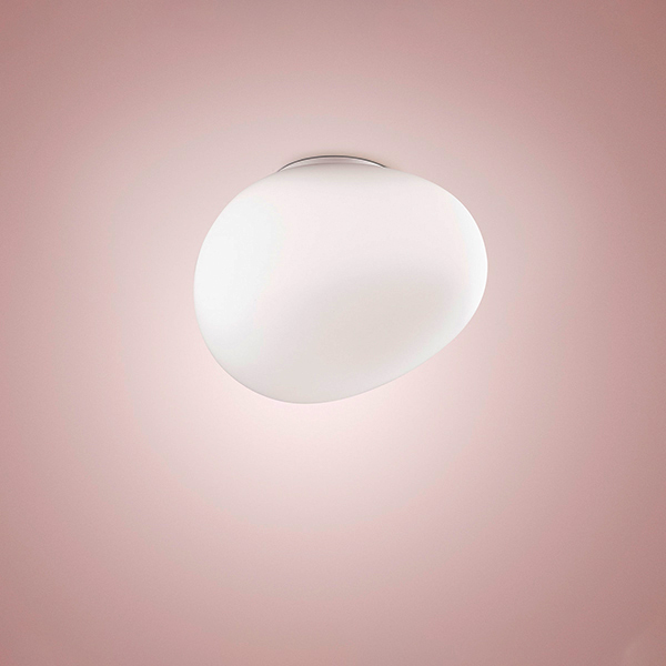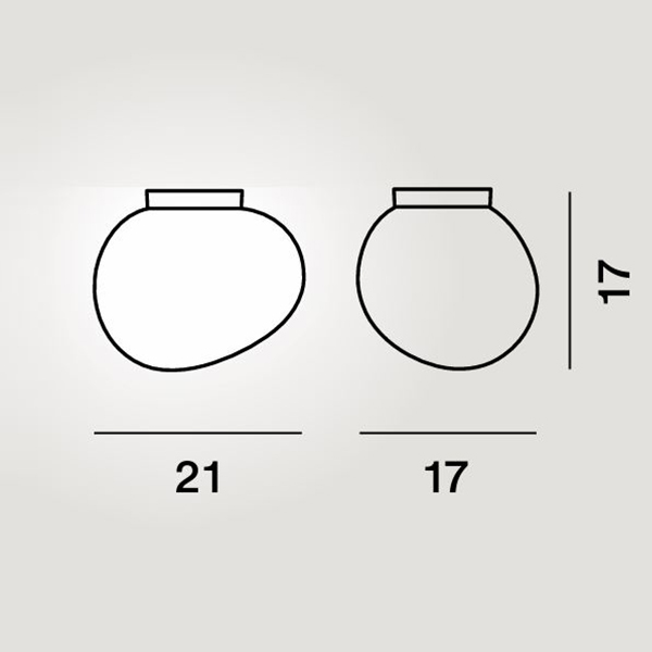 Ceiling lamp with diffused light. White satin finish hand-blown diffuser achieved using a glass blowing procedure without turning the glass in the mould (referred to as “stationary”), which then undergoes immersion in acid. The glass in the medium version is incorporated with a matt transparent injection moulded polycarbonate ring nut, which is in white polycarbonate in the small version. Mount and ceiling mount in epoxy powder coated metal and matt injection moulded transparent polycarbonate lamp holder support.