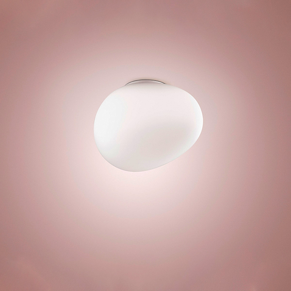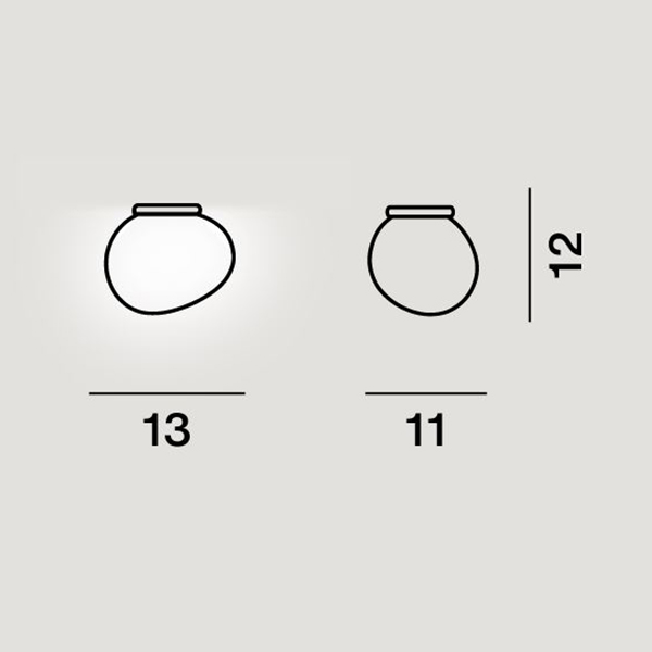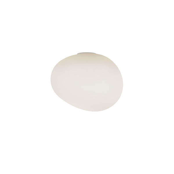 Ceiling lamp with diffused light. White satin finish hand-blown diffuser achieved using a glass blowing procedure without turning the glass in the mould (referred to as “stationary”), which then undergoes immersion in acid. The glass in the medium version is incorporated with a matt transparent injection moulded polycarbonate ring nut, which is in white polycarbonate in the small version. Mount and ceiling mount in epoxy powder coated metal and matt injection moulded transparent polycarbonate lamp holder support.