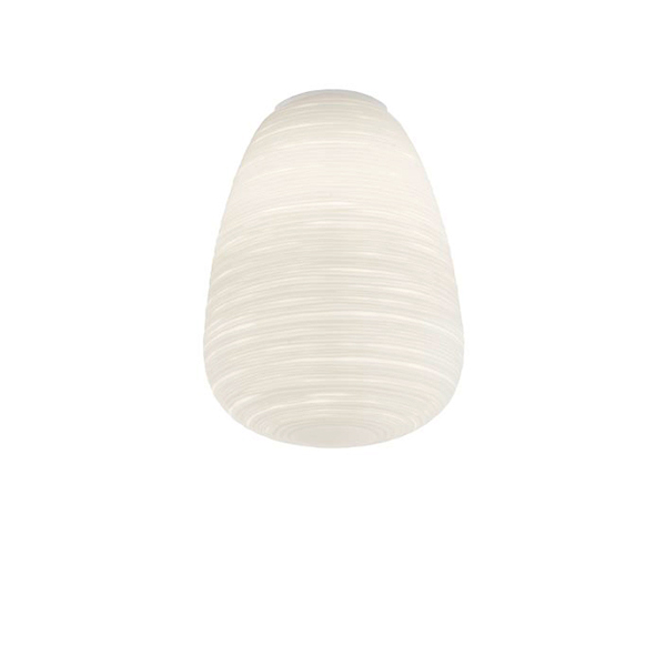 Collection of ceiling lamps with diffused light. Three diffuser shapes in blown glass with striped effect, achieved using a mould with negative decorations which are transferred to the surface of the glass, which is then manually ground “by belt” and then undergoes immersion in acid in order to emphasise the plaster-like effect. Ceiling mounting plate in epoxy powder coated metal.