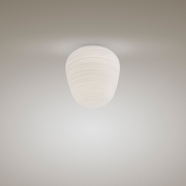 Collection of ceiling lamps with diffused light. Three diffuser shapes in blown glass with striped effect, achieved using a mould with negative decorations which are transferred to the surface of the glass, which is then manually ground “by belt” and then undergoes immersion in acid in order to emphasise the plaster-like effect. Ceiling mounting plate in epoxy powder coated metal.